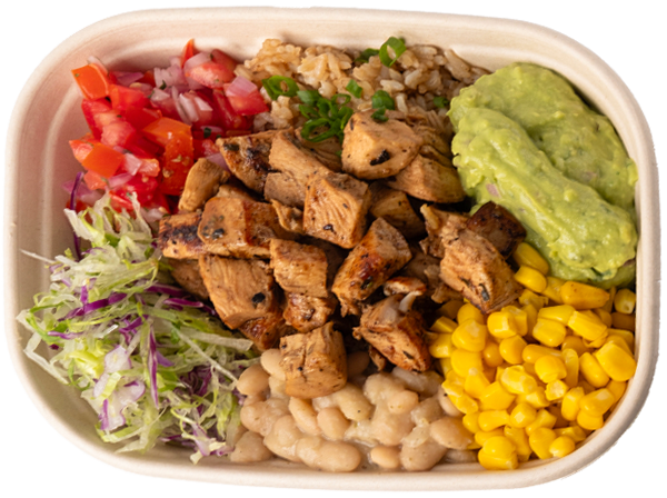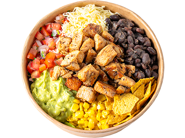 Arma tu burrito en tortilla de trigo con pollo al grill, 2 bases, 4 toppings y 2 salsas.