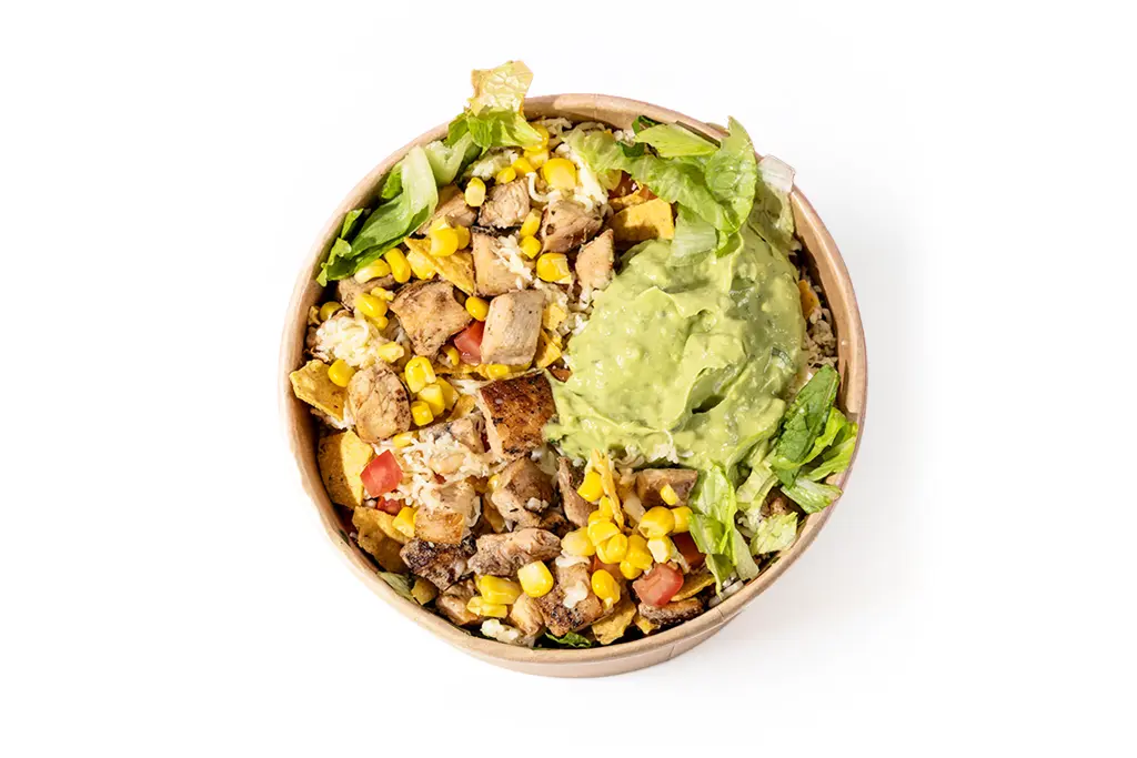 Pollo grill, mix de lechugas, queso mozzarella, tomate, nachos, guacamole, choclo americano y 1 aliño.